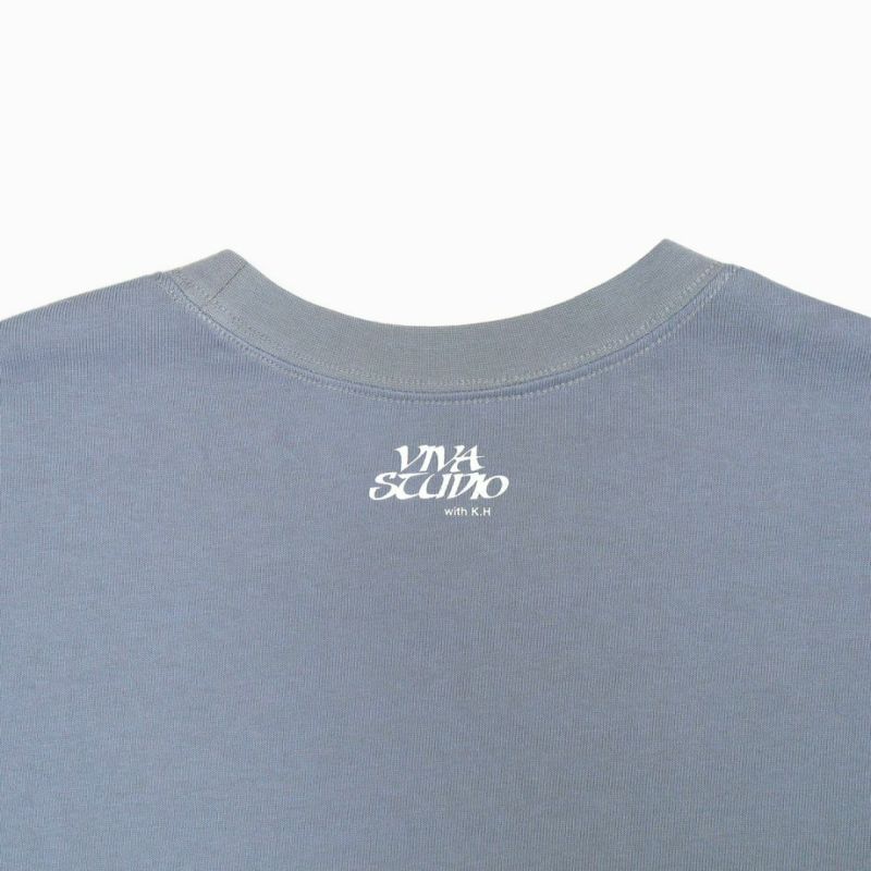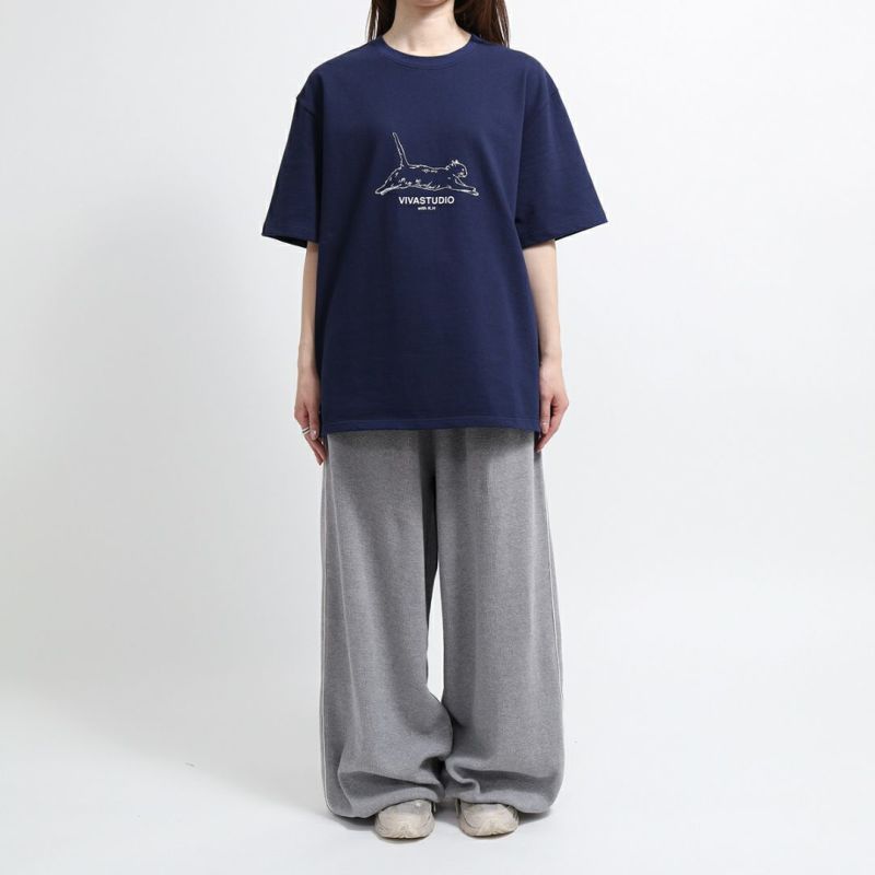 樋口幸平の愛猫・モモちゃんをモチーフにした、自由に駆ける猫のグラフィックプリントがアクセントとなり、単体での着こなしはもちろん、ジャケットやシャツのインナーとしても映える万能アイテム。