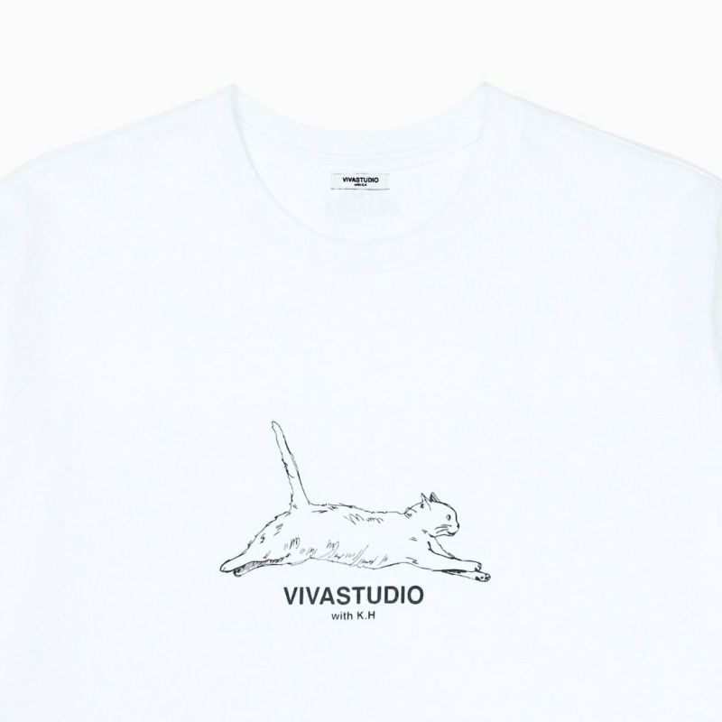 樋口幸平の愛猫・モモちゃんをモチーフにした、自由に駆ける猫のグラフィックプリントがアクセントとなり、単体での着こなしはもちろん、ジャケットやシャツのインナーとしても映える万能アイテム。